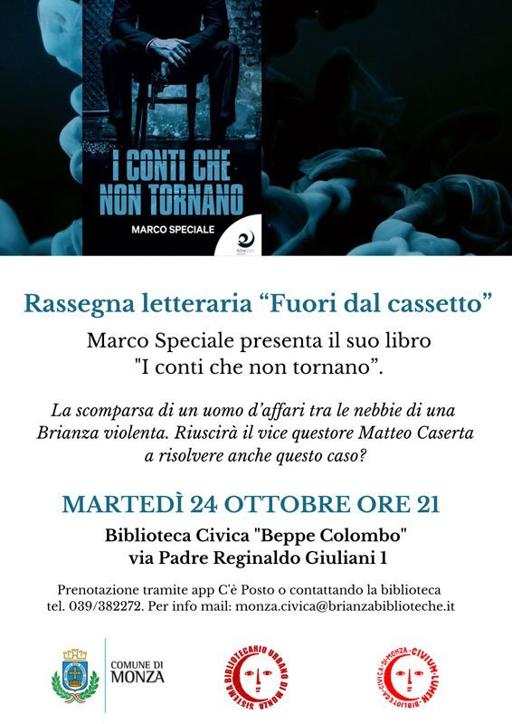 Lo scrittore Marco Speciale presenterà il suo ultimo romanzo I conti che non tornano. Il vice questore Matteo Caserta si trova alle prese con un nuovo caso da risolvere, in cui si intrecciano mondo della finanza e realtà industriale, in una Brianza quanto mai vicina alla realtà odierna.